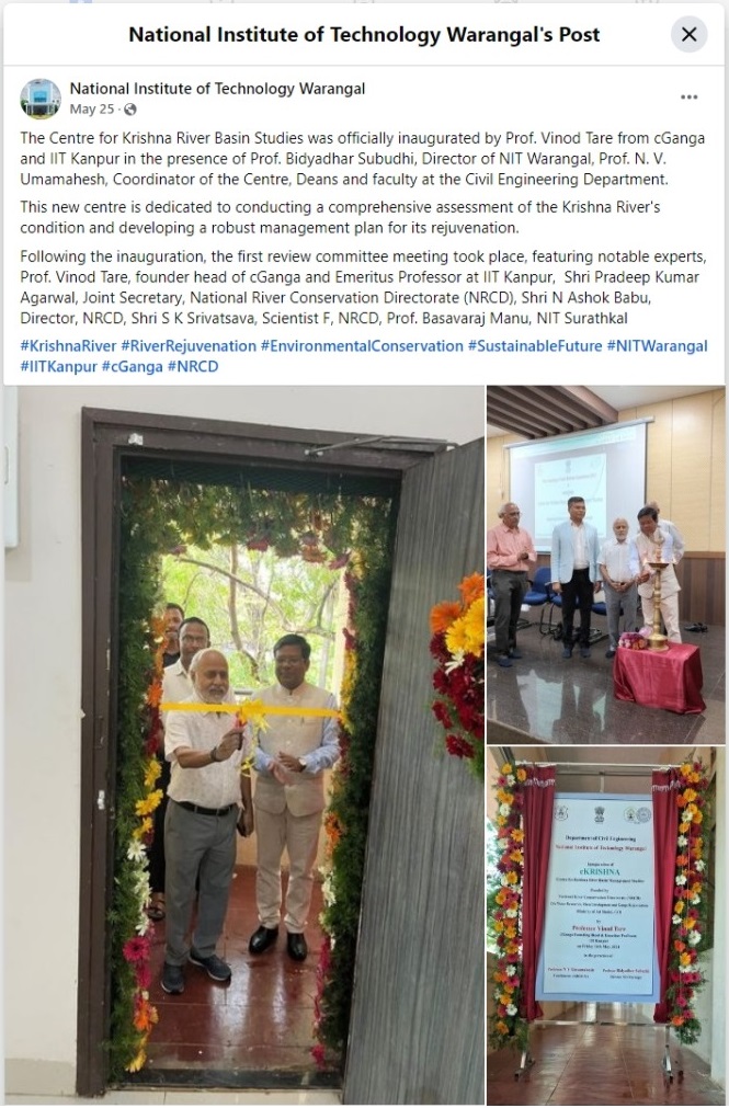 The Centre for Krishna River Basin Studies was inaugurated by Prof Vinod Tare, Centre for Ganga Basin Management and Studies (cGanga), Emeritus Processor, IIT Kanpur, and National Institute of Technology (NIT) Warangal Director Prof Bidyadhar Subudhi